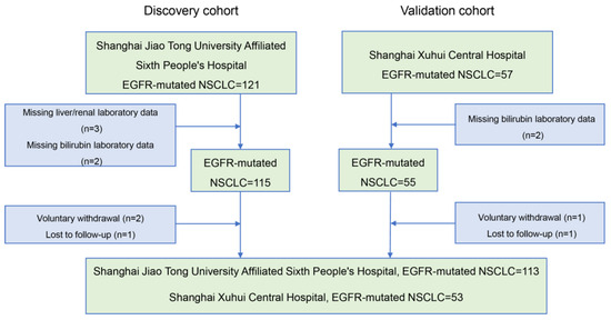 Twelve patients were excluded from the study based on inclusion and exclusion criteria (Figure 1). We enrolled 166 patients diagnosed with NSCLC harboring EGFR mutations and treated with EGFR-TKIs. The patients were divided into two cohorts: the discovery cohort, consisting of 113 patients from Shanghai Jiao Tong University Affiliated Sixth People’s Hospital, and the validation cohort, comprising 53 patients from Shanghai Xuhui Central Hospital. The detailed baseline characteristics of these patients are presented in Table 1.