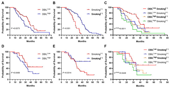 Similarly, shorter OS was observed in the DBILhigh group (p = 0.0406) (Figure 2D) and the Smoking+ group (p = 0.0314) (Figure 2E). The shortest OS was in the DBILhigh Smoking+ group, and the longest was in the DBILlow Smoking− group (p = 0.0449) (Figure 2F), consistent with the results in the discovery cohort.