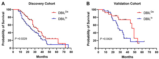 Patients whose DBIL increased from pre-treatment to post-treatment were defined as the DBIL-increase (DBILin) group, whereas those whose DBIL decreased were classified as the DBIL-decrease (DBILde) group. K–M analysis revealed shorter OS in the DBILin group in both the discovery (p = 0.0229) (Figure 4A) and validation (p = 0.0424) cohorts (Figure 4B).