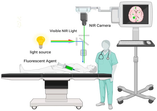 The employment of fluorophores—dyes or compounds that can absorb and emit light at particular wavelengths in the (NIR) spectrum—is the mechanism underpinning infrared fluorescence-guided surgery. It is common practice to provide these fluorophores intravenously either before or during surgery [61]. The fluorophores fluoresce or release light in the (NIR) spectrum when exposed to a certain wavelength of light. This light is then detected by specialist imaging equipment. Indocyanine green (ICG), which preferentially accumulates in tumor tissue due to its damaged blood—brain barrier, is the most often utilized fluorophore in glioblastoma resection procedures [62]. Surgeons can view the fluorescence released by the tumor tissue by utilizing NIR light to activate the fluorophore after it has accumulated in the tumor. This real-time feedback aids in differentiating the tumor from healthy brain tissue, leading to more accurate and complete resection. Compared to visible light, the NIR spectrum allows deeper tissue penetration, which makes it highly advantageous. This implies that tumors that are situated below the surface of the brain tissue can also be seen [63]. Furthermore, NIR fluorescence lessens background noise from surrounding tissue, helping to visualize differences between healthy and tumorous areas. As illustrated in Figure 2, the setup for NIR-guided surgery involves activating the fluorescent agent with NIR light, capturing the emitted signal through a specialized NIR camera, and displaying it on a monitor to guide tumor resection with greater precision.