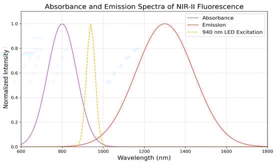 Infrared fluorescence-guided procedures have transformed treatment for glioblastoma through surgery by giving surgeons real-time tumor visibility using fluorophores and NIR imaging, facilitating more thorough and accurate resections [67]. The selection of ideal wavelengths and imaging modalities is crucial for optimizing the advantages of this strategy, ultimately enhancing GB patient outcomes. An important consideration in infrared fluorescence-guided surgery is wavelength selection. NIR-II, which has a wavelength range from 1000 nm to 1700 nm, is suitable for glioblastoma resection because it provides broader penetration depths and finer image details. NIR-II wavelengths outperform the NIR-I spectrum (700 nm–1000 nm) by offering high contrast, low scattering, and compatibility with fluorophores like ICG [68]. As summarized in Table 4, the technical advantages of NIR-II wavelengths—such as deeper tissue penetration, reduced scattering, and improved visualization—play a crucial role in achieving safer and more effective tumor resections. Figure 3 illustrates the absorbance and emission spectra of NIR-II fluorophores with 940 nm LED excitation, where emission intensity peaks around 1300 nm within the NIR-II window (1000–1700 nm). This optimal alignment maximizes fluorescence intensity and resolution during surgical imaging, demonstrating the technical benefits of NIR-II wavelengths by enabling deeper penetration and minimizing scattering. As a result, surgeons can achieve more thorough tumor resections and better visualize tumor margins and residual cells, reducing the risk of recurrence and increasing the safety of resection, and ultimately improving patient prognosis. As technology advances, NIR fluorescence’s effectiveness in GBM surgery may be further enhanced by integrating it with other modalities, such as intraoperative MRI or targeted medicines [69].