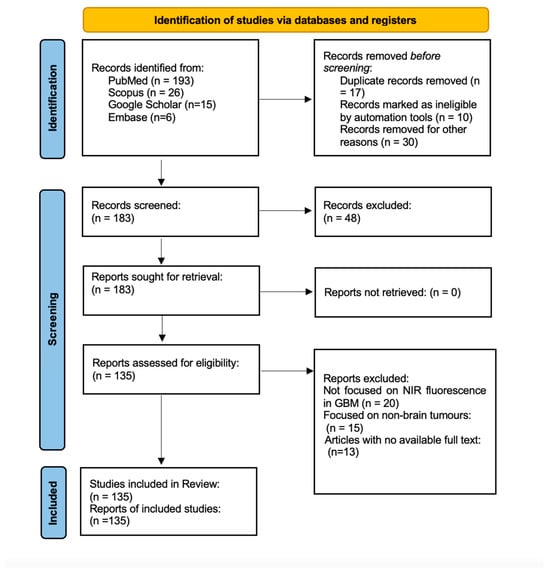 We conducted an extensive search across multiple databases, including PubMed, Scopus, Google Scholar, and Embase. We considered all publications up to 1 September 2024. To refine our search, we used a mix of keywords including “near-infrared fluorescence”, “glioblastoma”, “fluorescence-guided surgery”, and “brain tumor”, combined with Boolean operators (AND, OR).