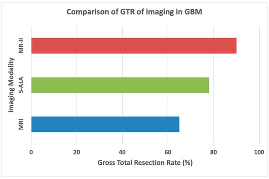 NIR-guided surgeries demonstrate GTR rates of 80–85%, a significant improvement compared to 62–68% achieved with conventional techniques such as 5-ALA-guided fluorescence [43,58,80]. The superior margin detection afforded by NIR technology allows surgeons to achieve maximal safe resection without compromising eloquent brain regions [81,82]. This reduction in residual tumor tissue decreases the risk of recurrence, contributing to better patient outcomes. As shown in Figure 5, the bar chart compares the GTR rates across imaging modalities, with NIR-II fluorescence achieving the highest rates, underscoring its value in improving the surgical precision and completeness of tumor resection in GB.