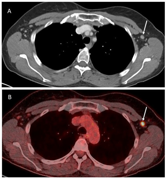 Axial contrast-enhanced CT image (A) showing a slightly enlarged lymph node in the left axilla (white arrow), corresponding to a pathologic activity on the PET-CT (B).