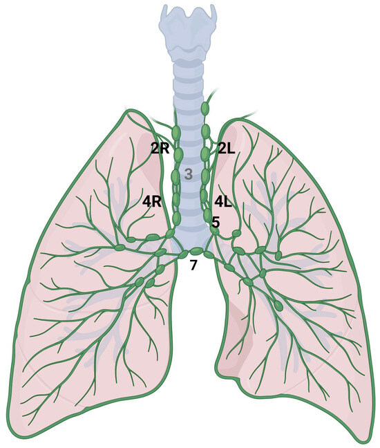 The mediastinum is located in the thoracic cavity, bordered by the sternum anteriorly, the vertebral column posteriorly, and laterally by the lungs. It is typically divided into four main compartments: the superior mediastinum, anterior mediastinum, middle mediastinum, and posterior mediastinum. The classification system, as defined by the International Association for the Study of Lung Cancer (IASLC), divides the mediastinal lymph node stations into the following categories (Figure 3) [42]. Station 2 comprises the upper paratracheal nodes that extend from the upper border of manubrium to the intersection of caudal margin of innominate vein with the trachea on the right (2R) and from the upper border of manubrium to the superior border of aortic arch on the left (2L). Station 3 comprises the pre-vascular and pre-vertebral nodes. Station 4 comprises the lower paratracheal nodes that extend from the intersection of the caudal margin of innominate vein with the trachea to the lower border of the azygos vein on the right (4R), and from the upper margin of the aortic arch to the upper rim of the left main pulmonary artery on the left (4L). Station 5 comprises the subaortic nodes (previously indicated as in the aorto-pulmonary space). Station 6 comprises the para-aortic nodes; station 7 comprises the subcarinal nodes [43].