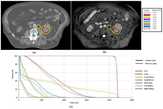 Illustration of an online adaptive plan for MR-guided SBRT. (a) Reference plan shown on the simulation CT image. (b) The adaptive plan for the 3rd fraction shown on the daily MR image. (c) The dose-volume histogram (DVH) comparing the reference plan (dashed lines) and the adaptive plan (solid lines).