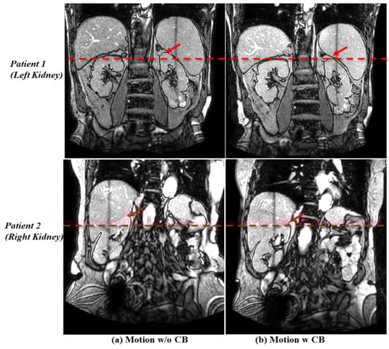 Examples of kidney target motion management with a compression belt (CB) in two patients undergoing magnetic resonance-guided stereotactic body radiation therapy. (a) Tumor motion without use of the belt was 18 mm for Patient 1 (top) and 13 mm for Patient 2 (bottom). (b) Tumor motion was significantly reduced with use of the belt to 7 mm for Patient 1 (with a left kidney tumor) and to 3 mm for Patient 2 (with a right kidney tumor), as shown by the dashed red lines and arrows.