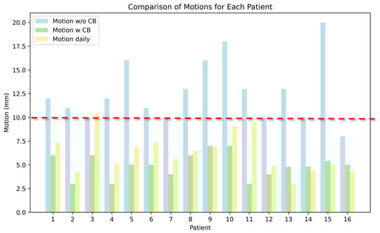 Comparison of respiratory-induced target motion in 16 patients, with and without use of a compression belt (CB) during MR-guided SBRT. Blue indicates cranio–caudal motion without the belt; green shows motion with the belt; and yellow indicates the average daily motion with the belt applied during treatment sessions. The red dashed line represents the clinical threshold of 10 mm, below which motion is considered sufficiently controlled to allow MR-Linac treatment. Although some patients experienced greater daily motion, it generally fell below the clinical thresholds for treatment, particularly if a belt was used during simulation.