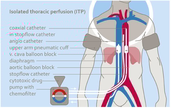 Isolated thoracic perfusion is a technique that isolates and temporarily decouples the thoracic region from the rest of the body’s blood flow. Isolation is performed using balloon perfusion catheters in the vena cava and aorta and pneumatic cuffs at the upper arms. The isolated area is connected to an external circuit consisting of a roller pump and hemofiltration machine.