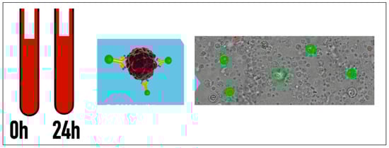 Before and 24 h after the procedure, 15 mL of EDTA blood was drawn and analyzed to quantify circulating tumor cells (CETCs/CTCs) using the maintrac approach [25]. Briefly, after red blood cell lysis, an immunofluorescence assay with a FITC (fluorescin isothiocyanate)-conjugated EpCAM (epithelial cell adhesion molecule) antibody was employed to identify CETCs/CTCs. An isotypic control was performed to determine background staining levels, and propidium iodide (PI) staining was used to differentiate living and dead cells. Red and green fluorescence analysis was conducted using a Fluorescence Scanning Microscope (ScanR, Olympus, Germany) for the visual examination of EpCAM-positive cells. Vital CETCs/CTCs were defined as EpCAM-positive cells with intact morphology and no nuclear PI staining. Only these cells were counted for analysis (Figure 3) [22,23,24,25,26,27,28,29].