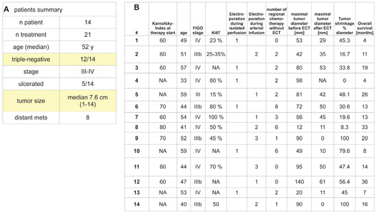 Patients and treatment: A total of 14 patients with the disease characteristics described in (A) were treated in 21 treatment cycles. Individual patient characteristics and treatment responses are described in (B). Treatment consisted either of arterial infusion into the mammarian/subclavian artery or the aforementioned treatment with the addition of isolated thoracic perfusion. All treatments were combined with reversible electroporation.