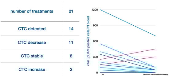 Results for CETCs/CTCs: Of 21 treatments, in 14 cases CETCs/CTCs were detected. Of these, in 11 cases the number of CETCs/CTCs decreased 24 h after the treatment, 2 had an increase, and 1 was stable. In the seven cases where no CETCs/CTCs were detected before the treatment, CETCs/CTCs were also not detected 24 h after the treatment. In total, eight cases had stable CTC numbers.