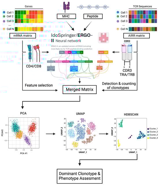 Figure 1); this was followed by performing log2 (Counts Per Million CPM) normalization on the merged matrix and counting full-length TCR clonotypes; we then performed Principal Component Analysis (PCA) for the merged matrix to assess data dimensionality and Uniform Manifold Approximation and Projection (UMAP) dimensionality reduction to co-embed the clonotype and predicted binding score and gene expression data. After that, we clustered the cells using HDBSCAN [