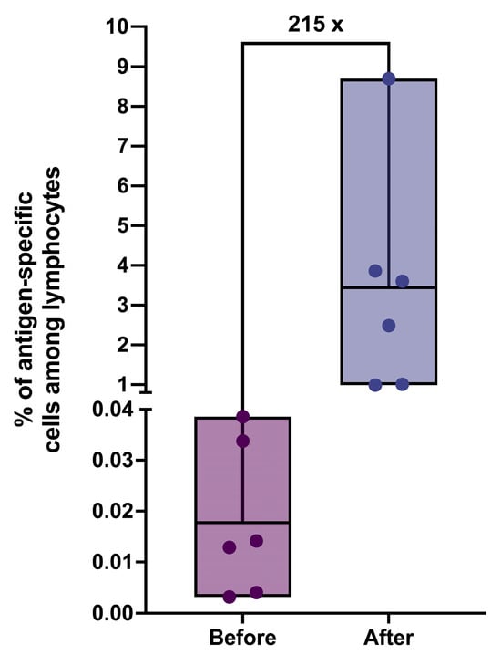 Following sorting, the antigen-specific T cells were transferred to a flat-bottomed culture plate at a concentration of 2–4 million/mL, where they were cultured under constant supervision in the presence of the following stimulants: anti-CD3 0.5 μg/mL, anti-CD28 1 μg/mL, IL-2, IL-7, and IL-15 each at a concentration of 10 ng/mL. The culture media consisted of equal parts of RPMI-1640 (1.3.4., Biolot, St. Petersburg, Russia) and the conditioned media from the CD8+ T cells culture. When assessing the state of cells, special attention was paid to the formation of cytotoxic lymphocyte aggregates within the culture, and the cells were reseeded, as needed, to achieve the desired number of cells for downstream application. The total duration of cultivation of antigen-specific T cells ranged from 14 to 21 days. The enrichment results were visualized in GraphPad Prism 10.2.3 using bar plots.