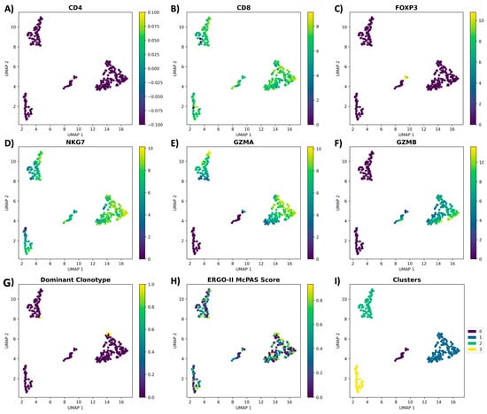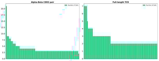 We processed the FASTQ files obtained from sequencer using the BD Rhapsody pipeline 1.11.1L (BD Biosciences, San Jose, CA, USA). The pipeline removed read pairs with low quality based on their read length, mean base quality score, and highest single-nucleotide frequency; analyzed the remaining high-quality R1 reads to identify cell label and unique molecular identifier (UMI) sequences; aligned the remaining high-quality R2 reads to the reference panel sequences (mRNA) using Bowtie2; collapsed reads with the same cell label, the same UMI sequence, and the same gene into a single molecule; adjusted the obtained counts by error correction algorithms, namely, recursive substitution error correction (RSEC) and distribution-based error correction (DBEC), in order to count for sequencing and PCR errors; and estimated cell counts using the second derivative analysis to filter out noisy cell labels by looking for the one inflection point and considering cell labels after that point to be noisy labels. Then, the pipeline used the molecular barcoded oligo-conjugated antibodies (BD™ Single-Cell Multiplexing Kit) to demultiplex the samples and filter out the multiples, which resulted in the pipeline calling 4989 single cells. Following that, the pipeline performed the per-cell alignment of TCR library reads to create TCR contigs, annotated the contigs, and created gene expression matrices for each biological sample and a cumulative Adaptive Immune Receptor Repertoire matrix of the TCR contigs.