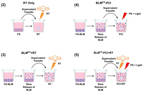 The basic experimental protocol for the FG-released drug is shown in Figure 1. It consisted of five arms: non-treatment controls (NTC), (2) RT only, (3) BLMFG-PCI only, (4) BLMFG +RT only, and (5) BLMFG-PCI + RT.