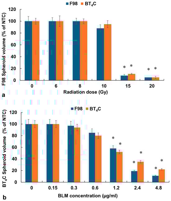 (a) RT effect on growth of F98 and BT4C spheroids over a range of radiation doses, 0–20 Gy. (b) Effect of BLM-PCI at varying BLM concentrations on F98 and BT4C spheroid growth. Data points are the average volumes of spheroids after 14 days in culture, represented as a % of the non-treatment control spheroid volumes. Error bars indicate standard deviation, and * represents significant differences (p < 0.05) when compared to controls.