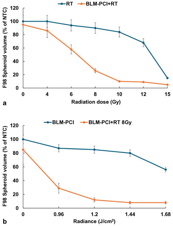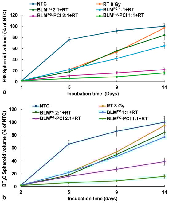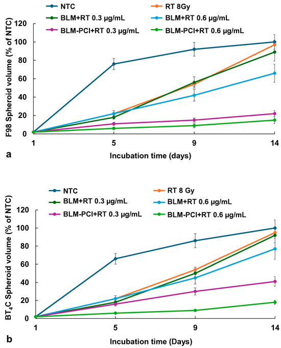 The kinetics of F98 and BT4C spheroid growth pattern, following NTC, RT, BLM + RT, and BLM-PCI + RT, are illustrated in Figure 3a,b. RT only (8 Gy) resulted in a significant delay in spheroid growth, but growth continued, and spheroid volume was equal to NTC volume after 14 days in culture. As seen in Figure 3a,b, RT alone (8 Gy) did produce a growth delay compared to NTC with RT-treated spheroids reaching 56% of NTC final volume on day 9 compared to 92% for control spheroids. A similar growth delay was also observed for both cell lines at RT = 10 Gy, with spheroids reaching 49% of NTC final volume at day nine.
