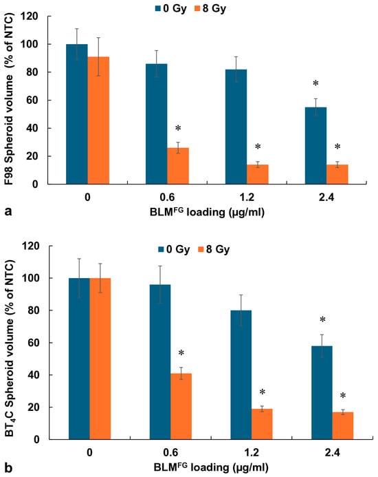 (a) Effect of increased concentration of BLM loading in FG, with 0–2.4 ug/mL on F98 spheroids that received no RT or received 8 Gy of RT. (b) BT4C spheroids with increasing concentration of FG-released BLM and given no RT or 8 Gy of RT. The average volumes of F98 spheroids after 14 days in culture, represented as a % of the non-treatment control spheroid volumes. Error bars indicate standard deviation, and * represents significant differences (p < 0.05) when compared to controls.