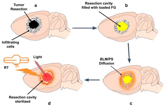 In order to allow for wound healing, postoperative external beam radiation and chemotherapy are delayed several weeks, allowing for disease progression to occur untreated. To obtain equivalent efficacy, a significantly lower RT dose is required when combined with BLM-PCI compared to what is required for RT alone. This, in turn, allows treatment to be initiated shortly after surgical resection and during the time interval of drug release. Several methods for both light and RT administration are available. A proposed translation to a rat animal GBM model is shown in Figure 8.