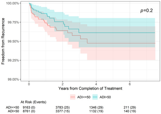 Freedom from recurrence over time of non-melanoma skin cancer treated with image-guided superficial radiation therapy by Area Deprivation Index (ADI) score. ADI ≤ 50 represents advantaged neighborhoods (high SES), and ADI > 50 represents disadvantaged neighborhoods. The “At Risk” value represents the sample size at the corresponding year of follow-up. The “Events” value represents the number of NMSC lesions that have recurred by the corresponding year of follow-up. The p value of 0.2 indicates that freedom from recurrence of the ADI > 50 group compared with the ADI ≤ 50 is not statistically significant.