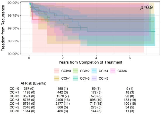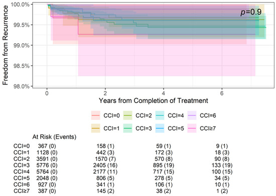 Freedom from recurrence rates by comorbidities (CCI score) at 2-, 4-, and 6-year follow-ups are summarized in Table 4, and the association between comorbidities and freedom from recurrence is illustrated in Figure 2 and Figure 3. Specifically, Figure 2 demonstrates the freedom from recurrence data for all CCI scores in this cohort (0–7+). However, due to the grouping of scores 0–6 far from CCI = 7, Figure 3 magnifies the data of CCI scores 0–6+ to better visualize these results. Freedom from recurrence ranged from 99.67% at 2, 4, and 6 years for a CCI of 0 to 99.27% at 2, 4, and 6 years for a CCI of ≥7. These differences were not statistically significant (p = 0.9).