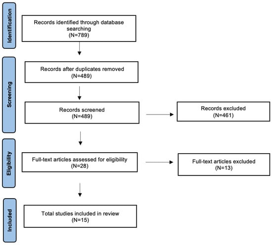A detailed review of the English-language literature on AI in HPV-related OPSCC was performed using PubMed/MEDLINE, EMBASE, and Cochrane Library databases. The search period was from 2017 to July 2024, with the aim of selecting the most recent studies. The terms used were “oropharyngeal cancer”, “HPV related oropharyngeal cancer” or “HPV-OPSCC” and “Artificial Intelligence”, “AI”, “Deep Learning”, “DL”, “Machine Learning”, “ML” or “Radiomics”. The search yielded 789 candidate articles. The search was performed according to the “Preferred Reporting Items for Systematic Reviews and Meta-Analyses” (PRISMA) for scoping review guidelines (Figure 1) [10]. The inclusion criteria applied were as follows: (i) publication date after 2017; (ii) studies aiming to use artificial intelligence to distinguish HPV-positive from HPV-negative OPSCC; and (iii) English language. Conference abstracts, case reports, retrospective studies, and publications written in a language different from English have been excluded. Two authors (AM and MM) have independently evaluated all titles, and relevant articles have been individuated according to inclusion/exclusion criteria; a senior author (AC) resolved any disagreements. At the end of the full-text review, 15 articles met the inclusion criteria [11,12,13,14,15,16,17,18,19,20,21,22,23,24,25].