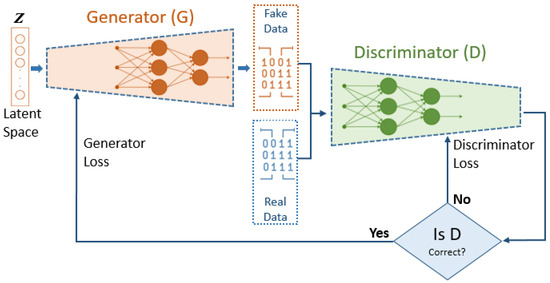 The training process of the generative adversarial network (GAN) follows an iterative adversarial framework that alternates between two main components: the generator and the discriminator. These two networks work in tandem, with each attempting to outperform the other through continuous competition [22,43]. Figure 2 illustrates the GAN training process, highlighting the key steps involved in optimizing both the generator and discriminator. The GAN employed consists of two primary components: the generator and the discriminator, both implemented as feedforward neural networks.