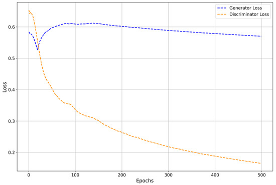 The training continues for multiple epochs, with both networks gradually improving. The generator refines its ability to produce synthetic data that become more similar to the real data, while the discriminator sharpens its ability to distinguish between real and synthetic instances [17,22,23]. This dynamic adversarial training process helps both components evolve in a complementary manner. The generator produces higher-quality synthetic samples as training progresses, while the discriminator gains better accuracy in identifying subtle differences between real and synthetic data [17,23,43]. Figure 3 illustrates the loss curves for both the generator and discriminator during the GAN training process, showing the adversarial dynamics as they evolve over epochs. This figure highlights the gradual improvement in the generator’s ability to create realistic samples, while the discriminator becomes more adept at distinguishing between real and synthetic data as training progresses.