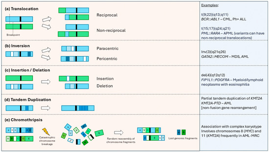- Gianfelici, V.; Lahortiga, I.; Cools, J. Chromosomal aberrations and fusion genes in myeloid malignancies. Expert. Rev. Hematol. 2012, 5, 381–393. [Google Scholar] [CrossRef]