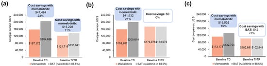 - Purser, M.; Liu, T.; Gorsh, B.; Wang, Z.; Le Lorier, Y.; Strakosch, T.; Samyshkin, Y. Estimating the financial impact of introducing momelotinib as a treatment option for adult patients with intermediate- or high-risk myelofibrosis with anemia from a US commercial and Medicare payer perspective. Poster D16. In Proceedings of the AMCP 2024, New Orleans, LA, USA, 15–18 April 2024. [Google Scholar]