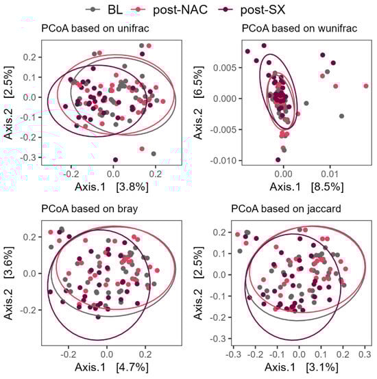 Beta diversity analysis, using principal coordinates analysis (PCoA) based on the unique fraction metric (unifrac), weighted unifrac (wunifrac), and the Bray–Curtis, and Jaccard dissimilarities, showed a significant difference between post-surgery and post-NAC timepoints (all p = 0.001) (Figure 2, Table S2). Redundancy analysis confirmed the profound impact of radical surgery on the gut microbiome changes (p = 0.014).