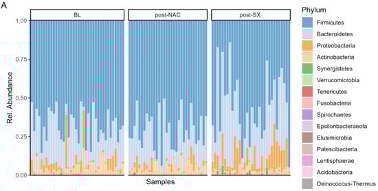 Bacterial composition of the gut microbiome at the (A) phylum and (B) genus level at different treatment timepoints; BL–baseline, NAC–neoadjuvant chemotherapy, SX–surgery (radical gastrectomy).