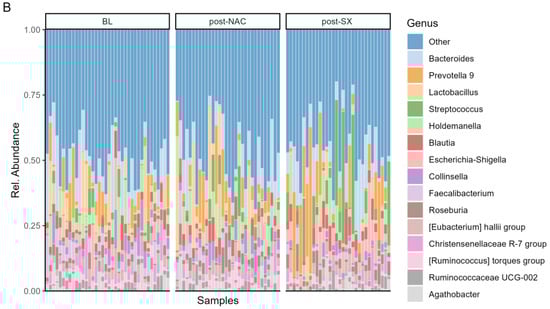 At the genus level, NAC treatment resulted in a significant decrease in the Christensenellaceae R-7 group (p = 0.041) compared to BL samples. In contrast, radical surgery led to an increase in Prevotella 9 (p = 0.022), Streptococcus (p = 0.010), and Escherichia-Shigella (p = 0.001). This combination also caused a decrease in Lactobacillus (p = 0.008), Collinsella (p = 0.005), Faecalibacterium (p = 0.030), and the Ruminococcus torques group (p = 0.006) (Figure 3B, Table S4).