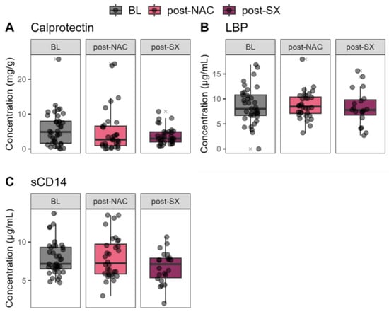 Fecal calprotectin, lipopolysaccharide-binding protein (LBP), and soluble Cluster Differentiation 14 (sCD14) biomarkers from the blood serum did not significantly change throughout the treatment (Figure 6).