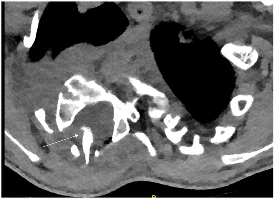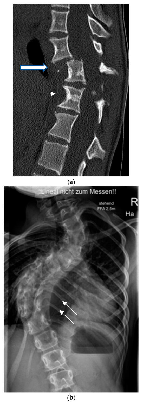 Severe, rigid, dystrophic curves (>60° Cobb) are best treated by a combined anterior and posterior fusion [8,12,45,46,47,48] which can be performed in the same or in two separate surgical settings. Due to the poor bone quality, the dystrophic osseous changes and the severity of the deformity, surgery is very challenging and meticulous preoperative evaluation of the osseous vertebral morphology, the paravertebral structures as well as the spinal canal are mandatory and of utmost importance. Besides upright native whole-spine radiographs and bending films, a whole-spine MRI should be performed in order to define critical space-occupying lesions, spinal cord compression, dural ectasia or vertebral erosion. Additionally, a thin-slice CT scan with sagittal, coronal and 3-D reconstructions is needed in order to assess the vertebral morphology and rotational deformity, as well as for the choice of instrumentation (transpedicular screws vs. sublaminar fixation). Particular attention is paid to the dystrophic apical region where osseous changes are the most pronounced. Meticulous analysis of the morphology, especially in severe cases, is mandatory. The presence of rib-head protrusion into the spinal canal through a neuroforamen, which is a typical finding on the convex side of the apical vertebra, should be ruled out since it may migrate more medially into the spinal canal during curve correction and exposes the spinal cord to high risk of compression and neurological damage (Figure 10).