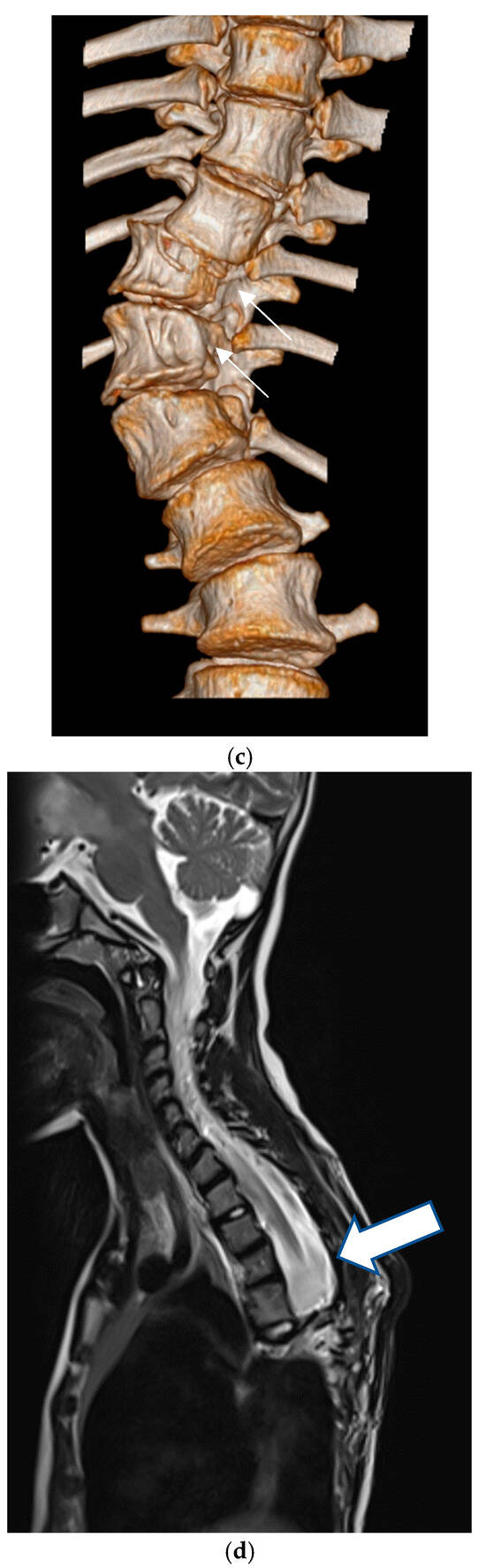 Dystrophic osseous features: (a) scalloping (thin arrow), rotation and dislocation with pathologic kyphosis (thick arrow), (b) rib penciling (white arrows), (c) wedging and rotatory dislocation (arrows) in a 3-D CT reconstruction, (d) widening of the spinal canal and dural ectasia (thick white arrow).