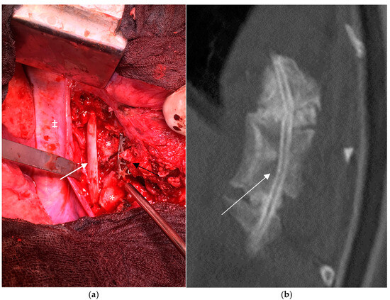 Transthoracic approach to the thoracic spine in a 15-year-old patient with dystrophic scoliosis and kyphotic deformity (a). Anterior strut rib graft (white arrow), anterior vertebral body support with an intercorporal mesh cage (black arrow), vertebral bodies (*), aorta (‡); (b) The rib graft (white arrow) in place with a bony fusion confirmed by a thin-slice CT scan.