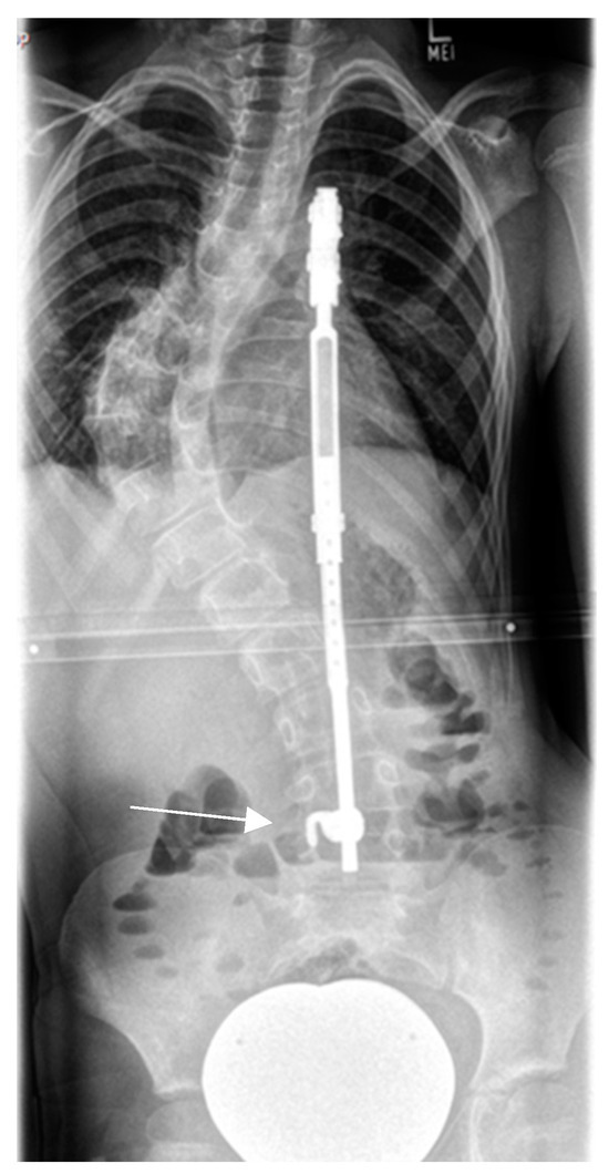 Rib-to-ilium VEPTR construct in a 9-year-old patient with a dystrophic curve. Distal migration of the laminar caudal anchor (white arrow) with loss of correction.