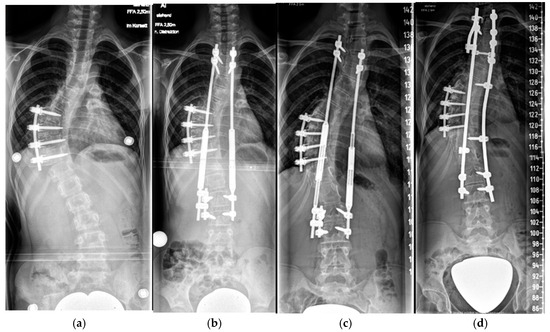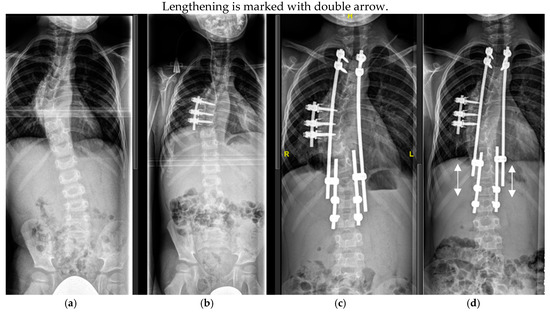 - Jain, V.V.; Berry, C.A.; Crawford, A.H.; Emans, J.B.; Sponseller, P.D.; Growing Spine Study Group. Growing Rods Are an Effective Fusionless Method of Controlling Early-Onset Scoliosis Associated With Neurofibromatosis Type 1 (NF1): A Multicenter Retrospective Case Series. J. Pediatr. Orthop. 2017, 37, e612–e618. [Google Scholar] [PubMed]