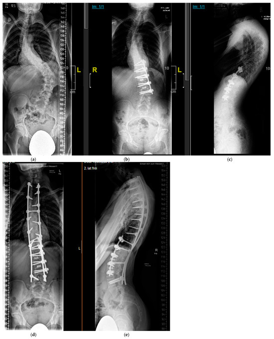 Sixteen-year-old patient with severe, rigid dystrophic scoliosis (a). After anterior instrumented spinal fusion T11-L3 with intervertebral mesh cages for restoration of physiologic lumbar lordosis (b,c). After combined anterior and posterior Fusion T2-L4 (d,e).