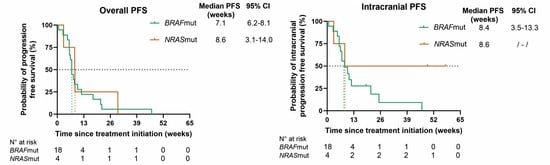 At database lock, all patients had progressed extra- and/or intracranially. In BRAFmut patients, the mPFS rates for overall, intracranial, and extracranial disease, respectively, were 7.1 (95% CI 6.2–8.1), 8.4 (95% CI 3.5–13.3), and 17.6 (95% CI 9.5–25.6) weeks; in NRASmut patients, the mPFS rates were 8.6 (95% CI 3.1–14.0), 8.6, and 29.7 weeks, respectively. The mOS rates in BRAFmut and NRASmut patients were 16.4 (95% CI 4.0–28.9) and 10.1 weeks (95% CI 0–54.1) (Figure 3).