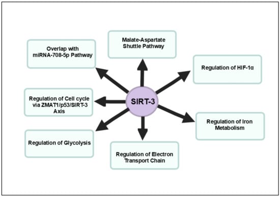 SIRT3 has also been reported to regulate iron metabolism in pancreatic cancer, where dysregulated iron homeostasis is a hallmark of malignancy. SIRT3 modulates the activity of iron regulatory protein 1 (IRP1), a key regulator of cellular iron levels through its control of iron-responsive element (IRE)-containing genes [97]. In SIRT3-deficient cells, the heightened production of ROS enhances IRP1’s binding affinity to IREs, leading to the aberrant upregulation of iron-related genes such as the transferrin receptor (TfR1), which governs iron uptake and promotes cancer cell proliferation. The loss of SIRT3 disrupts iron homeostasis, resulting in iron overload and dysregulated TfR1 expression, phenomena observed both in SIRT3-null cells and in the pancreatic tissues of SIRT3-deficient mice. Importantly, SIRT3 acts as a tumor suppressor by attenuating TfR1 expression and iron uptake, thereby curbing the proliferative capacity of pancreatic cancer cells. This underscores a novel mechanistic link between SIRT3’s tumor-suppressive function and its regulation of cellular iron metabolism, positioning SIRT3 as a critical metabolic modulator in pancreatic carcinogenesis. A recent report suggested that SIRT3 is also involved in the regulation of the electron transport chain (ETC) in pancreatic cancer, particularly through its modulation of mitochondrial complex II (CII) activity [98]. As a key component of mitochondrial bioenergetics, SIRT3 maintains the functionality of CII, also known as succinate dehydrogenase (SDH), which is integral to the transfer of electrons to ubiquinone in the ETC. In pancreatic cancer cells, the dysregulation of SIRT3 correlates with impaired CII activity, contributing to mitochondrial dysfunction and promoting tumor progression. SIRT3 loss enhances the expression of HIF-1α, a driver of hypoxia-mediated metabolic reprogramming in cancer, leading to an increased reliance on glycolysis and reduced oxidative phosphorylation. The diminished activity of SDH subunits C and D, along with SIRT3 downregulation, disrupts electron flow within the ETC, resulting in elevated ROS production and apoptosis resistance. However, pharmacological agents like chrysin nanoparticles (CCNPs), which restore CII activity and SIRT3 expression, have demonstrated significant potential in reactivating ETC function, thereby inducing apoptosis and reducing the viability of pancreatic cancer cells. By preserving mitochondrial integrity and curbing aberrant ETC regulation, SIRT3 serves as a critical suppressor of oncogenic metabolism, positioning it as a key therapeutic target in pancreatic ductal adenocarcinoma.