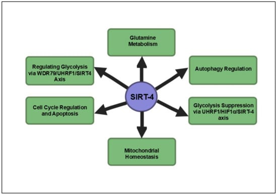 - Bai, Y.; Yang, J.; Cui, Y.; Yao, Y.; Wu, F.; Liu, C.; Fan, X.; Zhang, Y. Research Progress of Sirtuin4 in Cancer. Front. Oncol. 2020, 10, 562950. [Google Scholar] [CrossRef]