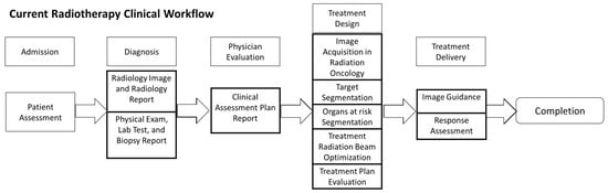 Tumor segmentation is a vital step in the diagnosis and treatment workflow. Figure 1 shows the current radiotherapy workflow, which starts with patient registration and assessment. The patient is then sent for radiology diagnostic image acquisition and pathology tests. The radiologist and pathologist provide their initial diagnosis based on the test as a report for the physician’s evaluation. Based on the physician’s clinical evaluation and radiology and pathology reports. A clinical assessment plan report is generated that not only includes the diagnostic reports but also the concluding diagnosis. To design the treatment, a new patient’s CT simulation scan is acquired, and then the pivotal step of target and organs at risk segmentation is carried out, which is critical for radiotherapy plan optimization and effectiveness of treatment. Treatment is delivered with image guidance, and the treatment response is assessed for potential amendment. If no further treatment is required, the treatment will be concluded.