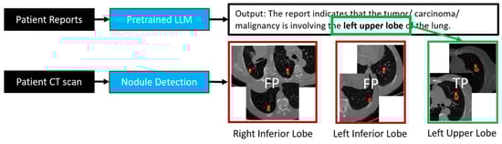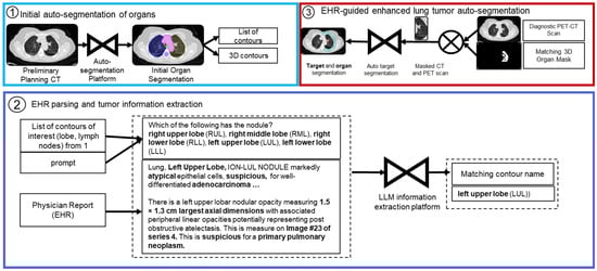 We verified our approach and demonstrated the effect of EHR-extracted information on the tumor segmentation model performance by conducting a comparison study. We used data from 10 test patients from the Johns Hopkins Hospital database, unseen by both the LLM and tumor auto-segmentation model. Once the nodules were detected and classified using the entire chest CT scan without any EHR guidance. Then the entire body was automatically segmented using the anonymized patients’ diagnostic CT scan for all organs, including lung lobes and lymph nodes. Next, auto-lung nodule detection and classification software detected and classified all supposedly malignant nodules.