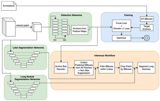 For the lung nodule detection model, training was conducted over 500,000 iterations, employing patch sizes of 96 × 96 × 96 (equivalent to 96 mm × 96 mm × 96 mm) with a batch size of 1. In the case of the lung nodule segmentation model, it underwent training for 300,000 iterations, with patch sizes set at 64 × 64 × 64 (64 mm × 64 mm × 64 mm) and a batch size of 1.