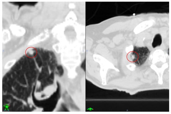 Figure 5. Case 6 where the nodule is very close to the chest wall, making the nodule detection very challenging. Left showing the coronal view, and right axial view, with tumor marked with red circle.