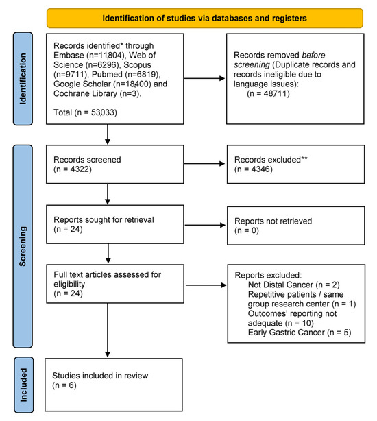 A systematic review adhering to the preferred reporting items for systematic reviews and meta-analyses (PRISMA 2020) guideline [29] was reported without the need for ethical approval. PubMed, Scopus, MEDLINE, Web of Science, ClinicalTrials.gov, the Cochrane Central Library, and Google Scholar were utilized for the search process. The initial search took place in November 2023, was repeated in March 2024, and updated on 1 July 2024. Medical subject headings (MeSH terms) such as “gastric cancer”, “gastric neoplasm”, “gastric carcinoma”, “gastrectomy”, “distal gastrectomy”, “survival”, “overall survival”, “disease-free survival”, and “cancer specific survival” were combined with “AND” or “OR” (Appendix A). All titles were reviewed, relevant abstracts were extracted, and the reference lists of identified articles were independently assessed by three authors (MC, AA, and FC). The systematic review was registered with the PROSPERO database (CRD42024582264).