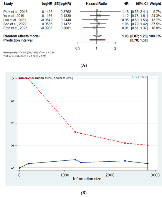 (A). Forrest plot for 5-year OS. HR: hazard ratio; 95% CI: confidence interval. (B). Trial sequential analysis for 5-year OS. X axis: Information size (number of patients); Y axis: Cumulative Z score; AIS: Accrued information size; Green line: Z=1.96; Red line: Monitoring boundary line; Blue line: Trial sequential analysis line [12,13,14,24].